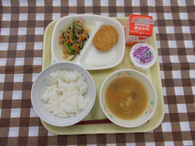 ごはん、野菜コロッケ、こまつなのナムル、きのこ汁、グレープゼリー、牛乳