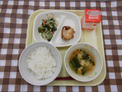 ごはん、鶏肉の照り焼き、酢の物、すまし汁、牛乳