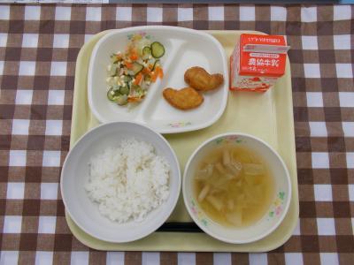 ごはん、チキンナゲット、チーズのサラダ、野菜スープ、牛乳