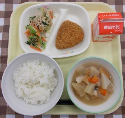 白ごはん、かぼちゃひき肉フライ、もやしのナムル、含め煮、牛乳