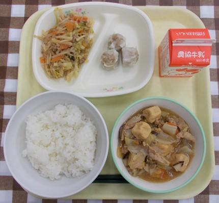 白ごはん、シューマイ、春雨の中華炒め、家常(ジャーチャン)豆腐、牛乳
