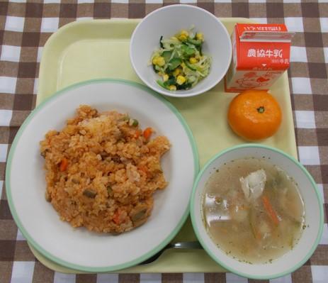チキンライス、サラダ、ペイザンヌスープ、みかん、牛乳