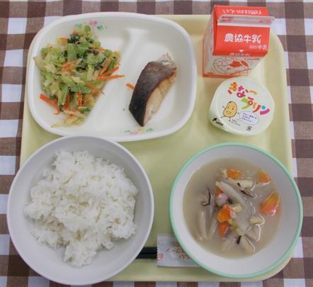 白ごはん、ばら焼き、いんげんのあえもの、どさんこ汁、牛乳