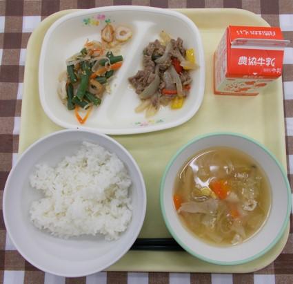 今日の給食では、豚肉、玉ねぎ、にんじん、ピーマンなど