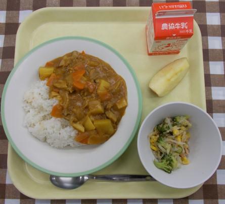 森のカレー、サラダ、りんご、牛乳