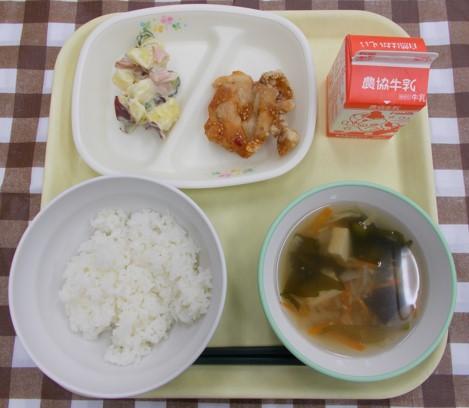 白ごはん、ヤンニョムチキン、さつまいもサラダ、中華スープ、牛乳