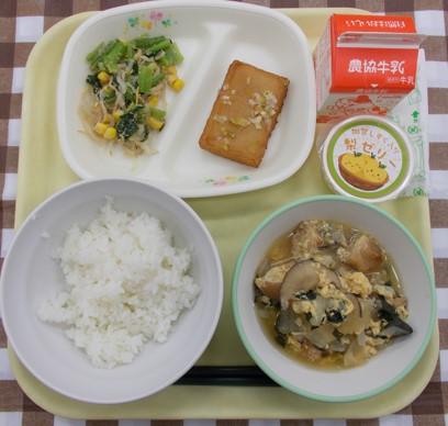 白ごはん、三味焼き、ごま和え、車麩の卵とじ、梨ゼリー