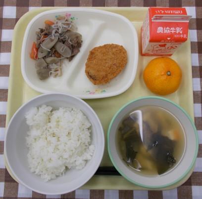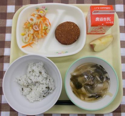 わかめごはん、メンチカツ、酢味噌和え、みそ汁、りんご、牛乳