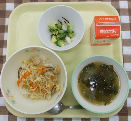 親子丼、野菜の昆布和え、みそ汁、牛乳