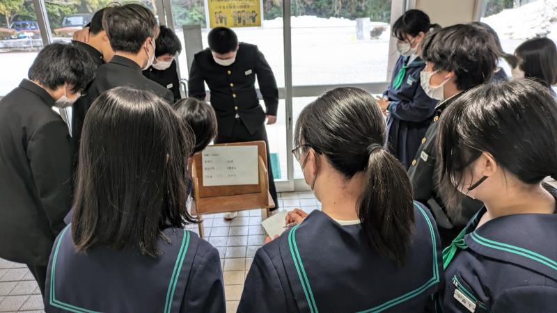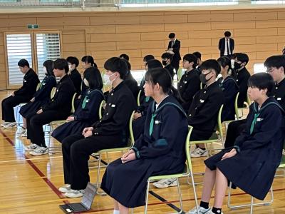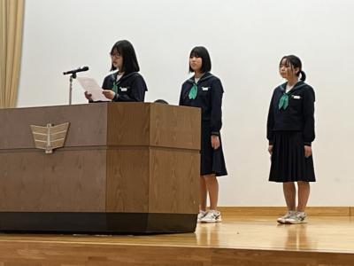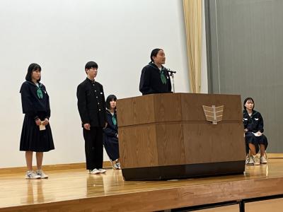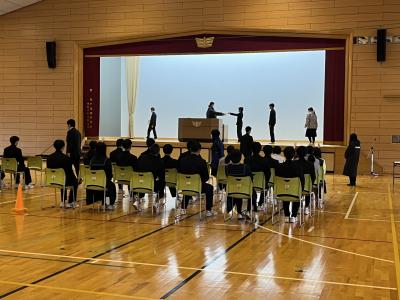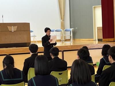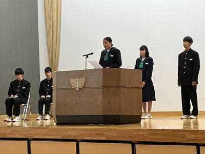 来年度の生徒会役員候補の立会演説会を開催しました。会長に複数名の立候補があり選挙戦になりました。応援弁士は、候補者の人柄や責任感などをアピールしていました。候補者は、それぞれ独自の具体的なアイディアを述べ、生徒会をどのように導きたいか熱弁していました。また、演説を聞く生徒の姿にも、よりよい生徒会にしようとする前向きな気持ちを感じました。