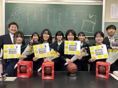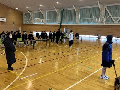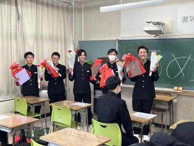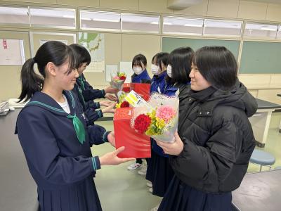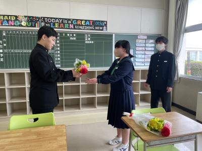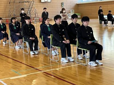本日午後、生徒会主催の「部活動お別れ会」をしました。それぞれの部活動ごとに、1・2年生が感謝の気持ちと受験への激励を述べ、色紙や記念品を贈りました。先輩からは、後輩へエールが贈られたようです。高校入試まで5日、卒業式まで9日です。卒業生には、中学校生活最後の山場を力強く乗り切ってほしいです!