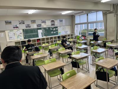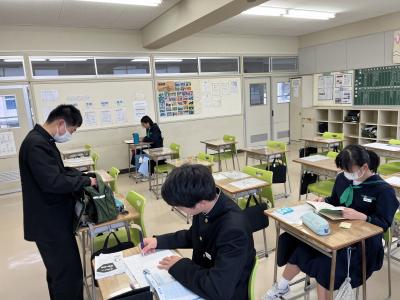 1・2年教室の朝の様子です。3年生が卒業したので以前よりは当然静かですが、1・2年生はそれ以上に落ち着いて朝を迎えることができているようです。課題の提出後は、身の回りの整理をして読書をしたり歓談をしたりして朝学活の時間を迎えます。