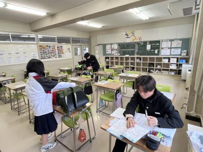 本日、高校入試2日目が行われ、緑丘中学校3年生は無事受験を終えました。3年教室は卒業式に向けて、ワックスがけのあと荷物の整頓がなされています。卒業式は明後日14日(金)午前10時会式、保護者の皆様の受付は午前9時20分~35分となっております。気を付けてお越しください。