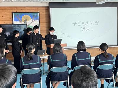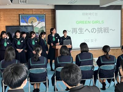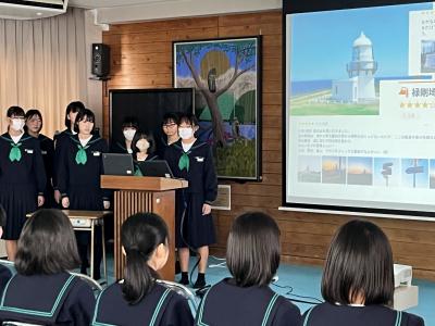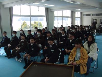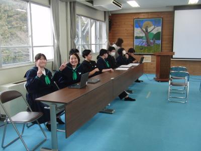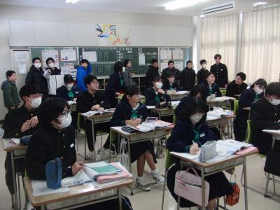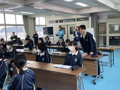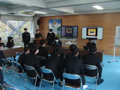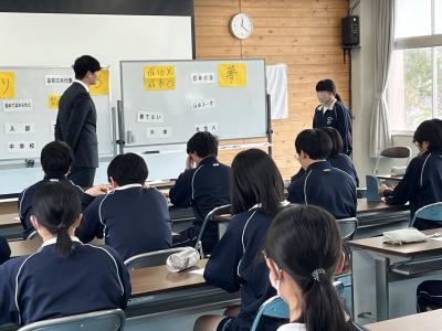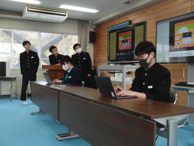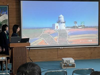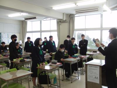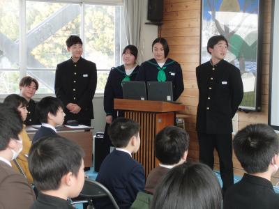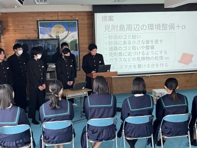 2年生は、4つのグループに分かれて、珠洲市のシンボル「見附島」「禄剛崎灯台」のこれからについて考えています。本日、それぞれのグループの提案を交流しました。「何回も訪れたいとは思わない」「元に戻すことが復興とは限らない」(2年生)といった課題を踏まえて、整備案や企画案など交流人口を増やす具体案を報告しました。資金捻出や費用対効果を問う質疑も続き、1班10分の持ち時間では足らないほど活発な話し合いがなされました。