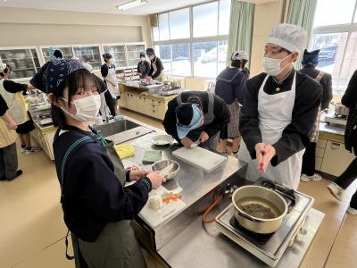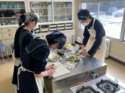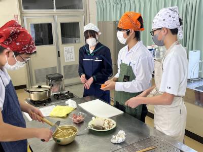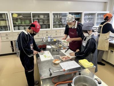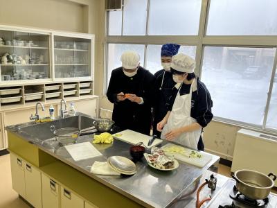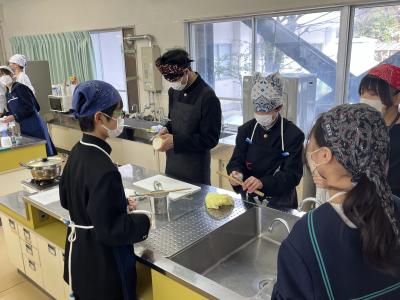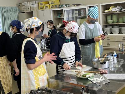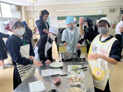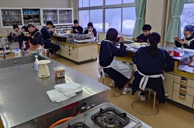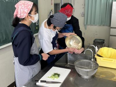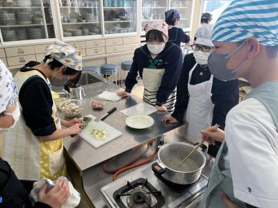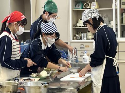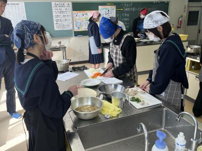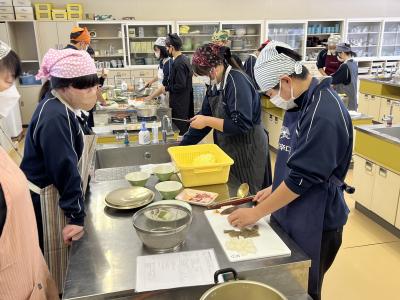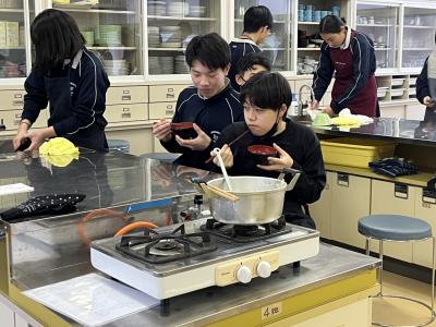 1年生が調理実習で「とん汁」をつくりました。初めての調理実習なので、安全に気を付け、手順を確認しながら実習を進めました。料理の経験や得手不得手を問わず、全員が作業に関わることも目標の1つにして、和気あいあいの雰囲気で実習が進みました。そして、様々な味⁉のとん汁が仕上がったようです。味見をすることを覚えた1年生でした。