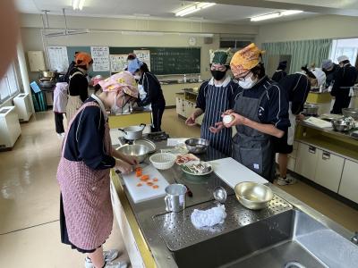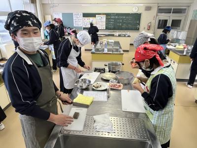 本日は、2年1組、2組の調理実習です。昨年度のこの時期は調理実習ができませんでした。そこで2年生にとっても、初めての調理実習でした。メニューは1年生と同じくとん汁。手際よく作業に入ることができていました。具材を水から炊き始めることで、美味しい出汁に仕上がりました。