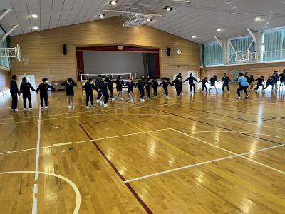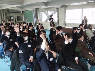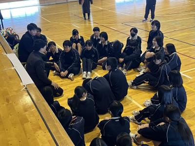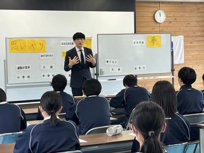 2年生を対象に、アズマックス先生(北國銀行ハニービー監督:東俊介さん)を講師に、標記の教室を開催しました。「絶対に成功させると強く思う」ことの大切さや、協力・成功させるために作戦を立てて取り組むことの大切さを、簡単なゲームを通して体感しました。「本気でやらないと、悔しくない。悔しくないと強くなれない」「適当にやっているとその癖がつく」といった言葉が生徒の心に響いたようです。後半は、アズマックス先生の経験をもとにしたトークの時間で、「夢には届かなかったけど近づくことはできた」「思いやりとは相手がされてうれしいことをしてあげること」など、生徒たちは身を乗り出して話を聞いていました。
