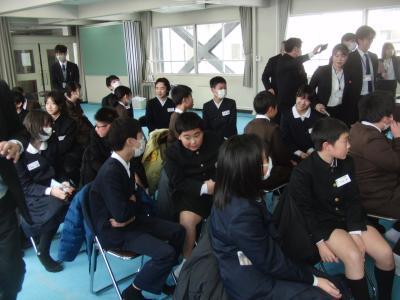校区6小学校の6年生が緑丘中学校に参集し、体験入学を実施しました。中学校では、2年生を中心に受け入れの準備をしました。中学生の問いかけへの応答や積極的な質問など、6年生のやる気がたくさんみられた時間でした。「みどりタイム体験版」では、他の小学校の児童とすぐに打ち解けて話す姿がありました。中学生の授業の様子を参観したり、校舎内の見学の後、数学の体験授業で締めくくりました。6年生の皆さん。4月の入学を心待ちにしています!!
