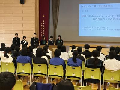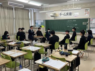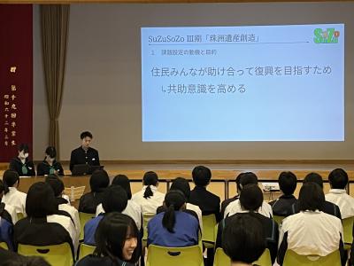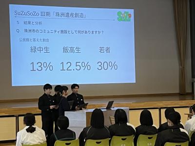 3年生が地域の方々(ヒト)・モノとかかわりあいながら、珠洲の未来の在り方(コト)について考えた提案を発表しました。課題設定から仮設、調査、考察した結果を班ごとに発表しました。地域の方だけでなく、高校生や金沢、東京の学生にもアンケートやインタビューをして、それを根拠に持論を展開しました。大学を誘致して若年層の交流人口を増やすというアイディアや、資料を集める過程で調査の対象とした人たちと自分たちとの考えの乖離に気づいたという意見に、2年生やゲストティーチャーの皆さんから関心のコメントが上がりました。