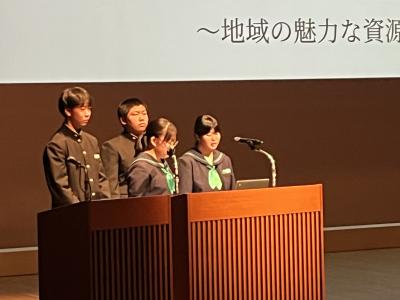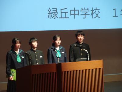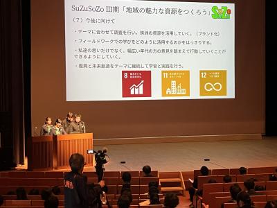 市内の小学校5・6年生と中学生がラポルトすずに集い、各校の代表がお互いの学習の成果を報告しました。緑丘中は各学年から4名ずつのメンバーで報告をしました。各学年のステージで考えた「SuzuSozo(珠洲創造)」について発表しました。