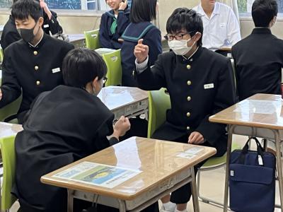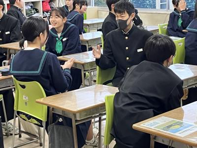 1年生の様子です。本日のお題は「質問じゃんけん」です。回を重ねるにつれ、誰とでも質疑ができ、質問への回答も早く深くなってきています。