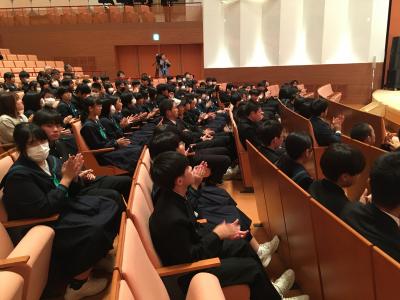 後半、私たちの合唱曲『居場所』や校歌を『生オケ』で全員合唱しました。プロのアレンジ・演奏による前奏が流れると、自然に感嘆の声がもれ聞こえました。