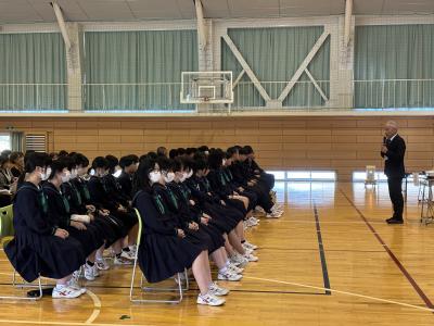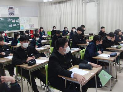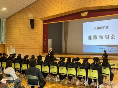 能登高校、飯田高校(説明順)の先生から、高校生活や学習の様子、学科の特徴、特色ある取組、そして高校卒業後の進路について説明を受けました。進路選択が目前に迫っている3年生はもちろん、2年生も真剣に話を聞いていました。その後、3年生とその保護者の方向けに、中学校から進路に関する日程や諸々の手続きについて説明しました。