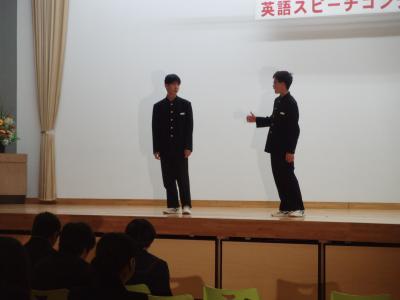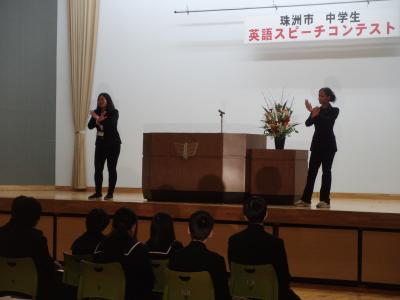 本日午後、緑丘中体育館で標記のスピーチコンテストがありました。市内中学校からの選抜生徒が英語スピーチの正確さや発音、流暢さなどを競い合い、代表を除く緑丘中生徒も聴く側として参加しました。コンテストの前には、珠洲市のALT(英語助手の先生)2人が、会場全体を巻き込んだウォーミングアップもありました。