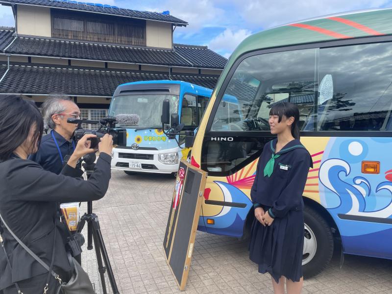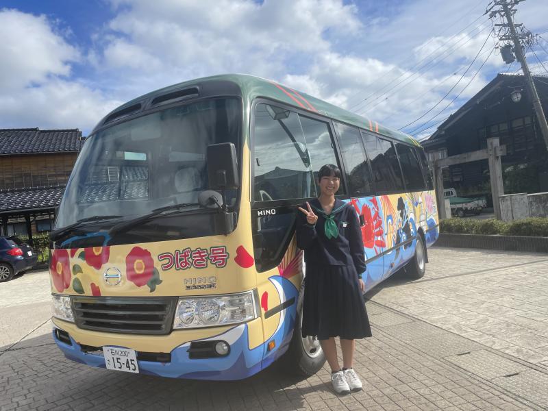 前面にはつばきの花が散りばめられ、鮮やかなバス車両となりました。一番のおすすめは?と聞かれると「カニです!」と答えていた西さんです。珠洲の町を鮮やかに、にぎやかに走っていく姿が楽しみです。