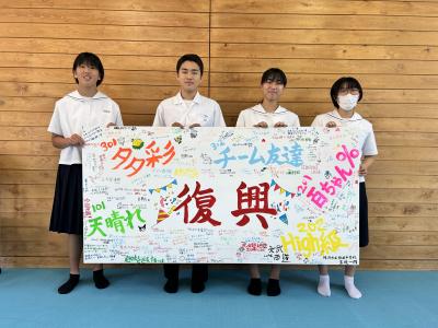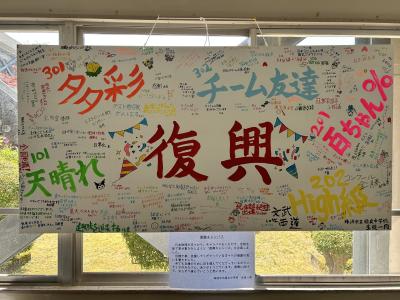 「どうせ描くなら、全校みんなで復興に向けて『頑張るぞ』という思いや、支援してくださる方への感謝の気持ちをアートとして作りたい」との思いから、生徒会執行部で企画をし、寄せ書きをしました。