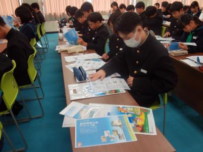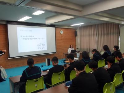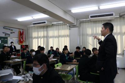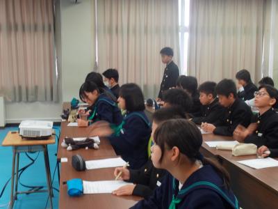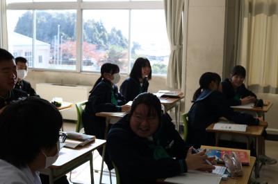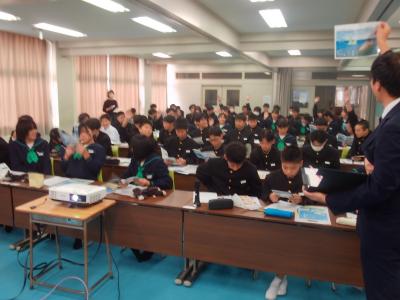 1・2年生の総合的な学習の時間に、「珠洲ふれあい講座」を利用して「いま行ける珠洲市の観光スポット」についてお話を聞きました。交流人口を増やそうとする珠洲市の取組を聞き、中学生が知らなかった・気づかなかった珠洲市の魅力について考えました。飲食店や宿の現状や、修学旅行の誘致などの具体的な取組の内容に対して、質問や意見が相次ぎました。