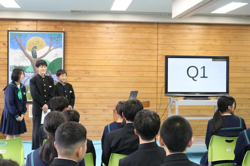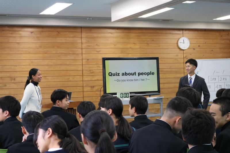 1年生の英語合同授業です。単元の目標として「クラス対抗クイズを出し合おう」と設定しました。