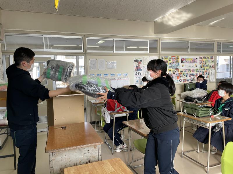 本日,支援物資として生徒たち一人一人に衣類が届けられました。