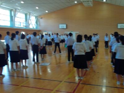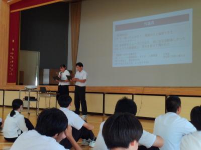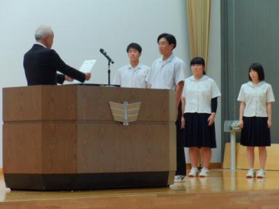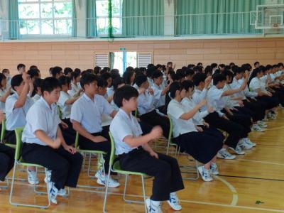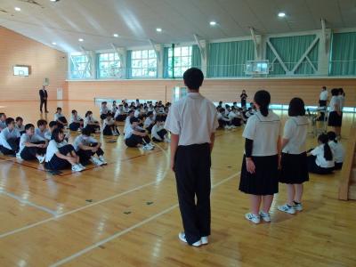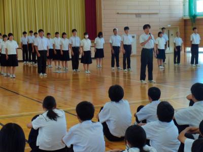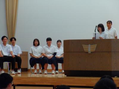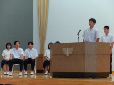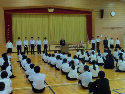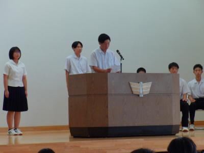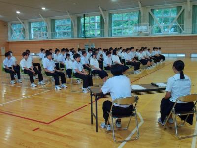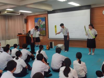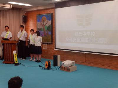 緑丘中学校では、毎年10月1日~8日を「交通安全意識向上週間」と位置付けて、交通安全推進のための様々な取組をしています。本日の集会を皮切りに、朝の街頭挨拶運動や安全たすき着用を再確認・推進します。生徒会執行部が中心となり、「緑丘中交通安全宣言」を採択し、交通安全を含めた安全な生活を送る決意を確認しました。