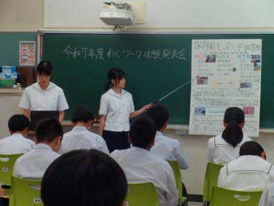 夏休みに行った2年生の職業体験(わくワーク)の発表会が行われました。