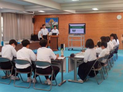 4名の立候補者が、それぞれのマニフェストを発表しました。生徒の意見をすいあげて折衝することや行事の改善点を具体的に上げて、目指す生徒会や学校像を訴えました。また、応援弁士の生徒たちはそれぞれの立候補者の人柄や行動力をアピールしました。聞く側の生徒たちも静かに、真剣に話を聞いていました。即日開票予定です。