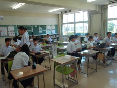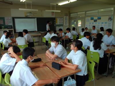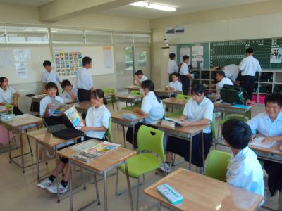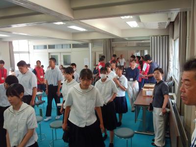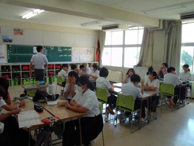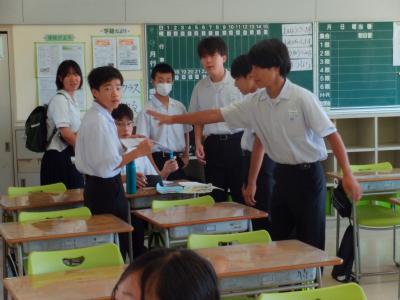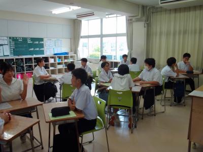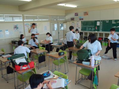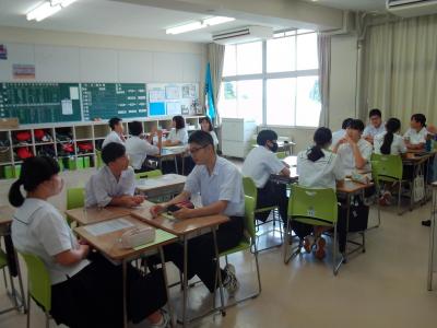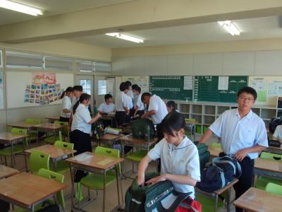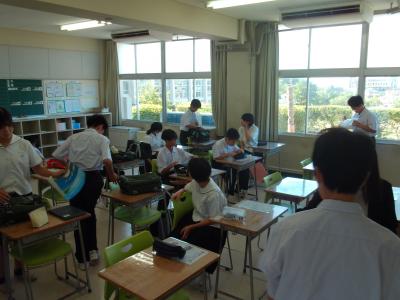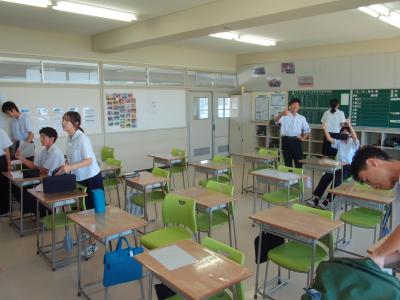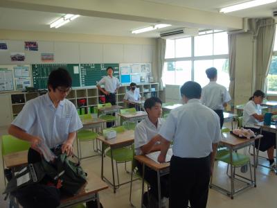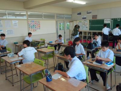 2学期開始に向けたウォーミングアップ登校です。写真は登校直後の様子です。友達と談笑する日に焼けた笑顔で、久しぶりににぎやかな教室になっていました。本日は、夏休みの課題確認テスト(国語、理科、英語)3教科を受けました。明日は2教科テストを実施予定です。