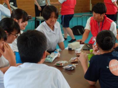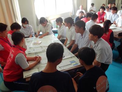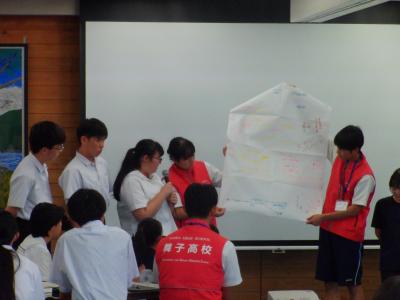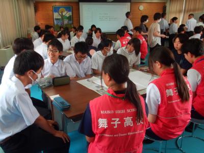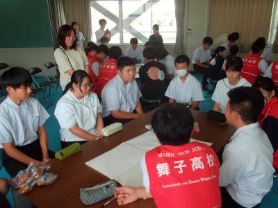 緑丘中、三崎中、舞子高校それぞれの防災教育に関する取組報告の後、6つのグループに分かれてトークタイムを持ちました。「地域の人といかにつながるか」「人とのつながりが防災・減災の第一歩だ」という意見が多く出て、そのために何をすればよいか話し合い共有しました。その後、舞子高校の生徒たちからお土産のクッキーを一人ひとりに頂き、記念撮影で締めくくりました。