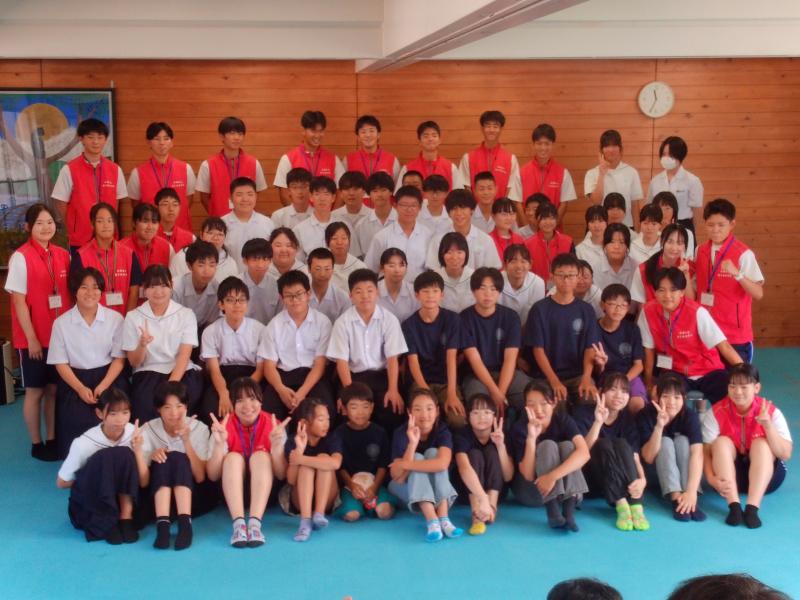 兵庫県立舞子高等学校環境防災科の生徒のみなさんと大阪府八尾市の河内太鼓メンバーの小中学生が、緑丘中学校を訪ねられました。本日は、緑丘中2年生が三崎中生徒と一緒にワークショップに参加しました。会場の多目的室では、高校生が花道をつくって迎えてくれました。