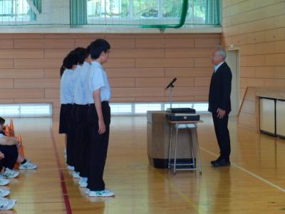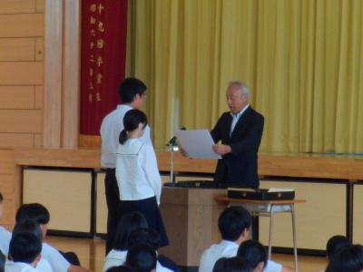 納賞後、漢字検定と理科作品研究作品展の表彰を行いました。生徒それぞれが、夏休みや普段の学校生活で取り組んできたことの成果が見られる、充実した式となりました。