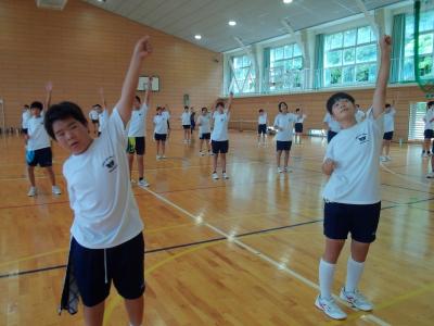 1年生と2年生を対象に、道具無しで行うことのできる運動から、タオル一つあれば行える気軽に行うことのできるものを紹介していただきました。生徒は明るく活発に身体を動かしていました。
