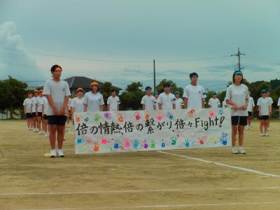 「倍の情熱 倍の繋がり 倍々Fight!」のスローガンのもと、体育祭を開催しました。今年度は「もっと地域とつながりを持ちたい!」という生徒会の強い思いから、地域や保護者の皆様に参加いただいたり、一緒に競技したりする企画を設けました。たくさんの保護者や地域の方にご参加いただきありがとうございました。