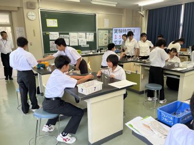 大谷小中学校7年生を迎えて、1年2組の理科で合同授業を実施しました。少し緊張していた面持ちも、実験を進めるうちに打ち解けていったようです。4種類の白い粉を見極めるために、水に溶かしたり加熱したりして、考えをまとめていきました。