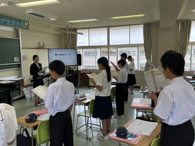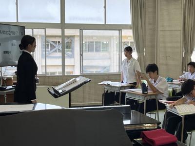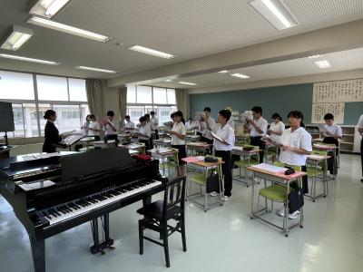 今月初めから教育実習生を一名受け入れております。教科は音楽。教育実習最終日の本日、1年生の授業で総仕上げの授業を実施しました。「主人は冷たい土の中に」を題材に、自分なりのイメージを言語化してまとめの合唱につなげていました。