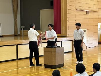 先週末に開催された、全能登大会と県中相撲選手権大会の納賞をしました。野球部はブロック優勝を飾り県大会への出場権を獲得しました。県中相撲では女子の部で個人準優勝を果たしています。(その他、女子テニス部の個人1ペアが県体に出場します)