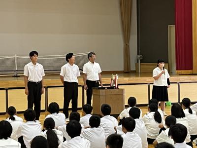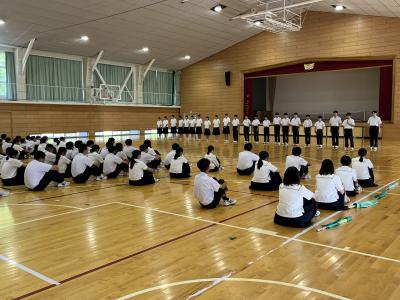 2025年7月18日 15時46分本日をもって、1学期終了です。終業式では、校長先生から改めて「命を大切にする」「生きる力を養う」「粘り強くチャレンジする」夏休みにすること、プラスワンの努力の大切さについてお話がありました。終業式の前には、県体の納賞や英語検定・漢字コンテストの表彰をしました。部活動や補習で生徒たちも登校する日もありますが、計画的な学習や規則的で健康な生活で過ごすことを期待します。