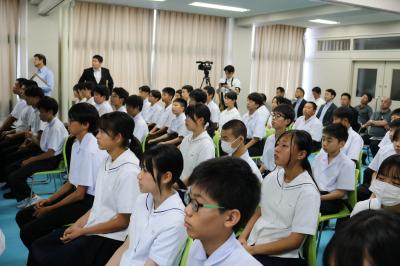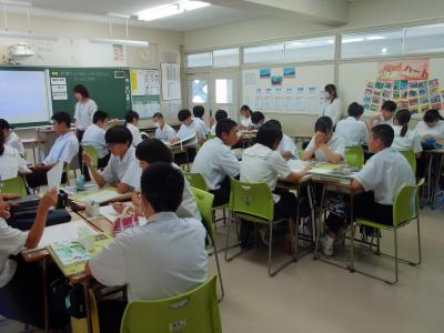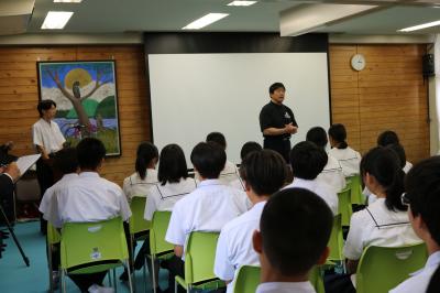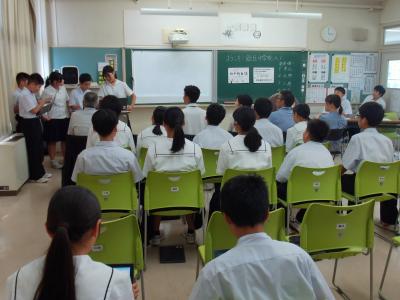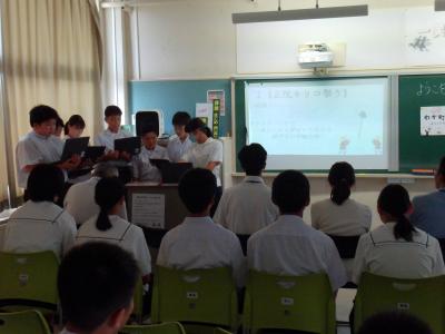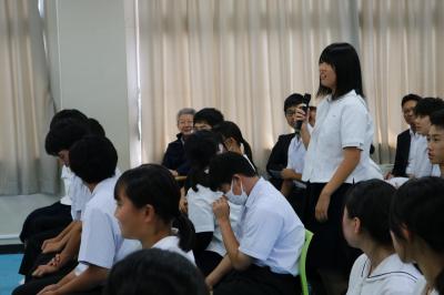 馳県知事が来校されて、緑中生と復興に向けた意見交換会を行いました。まず、3年生の代表が「復興に向けて自分たちができること」と題して、総合的な学習の時間で取り組んでいることを報告しました。その後、学級代表や挙手で発言を求めた生徒の質問に対して、知事が丁寧に説明をしてくださいました。最後に、生徒会長が「知事が言われた心の復興を私たちも大切にしていきたいと思います」と決意をもって挨拶をしました。