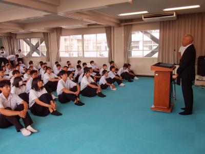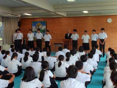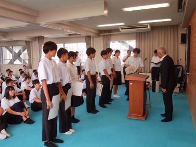 本日をもって、1学期終了です。終業式では、校長先生から改めて「命を大切にする」「生きる力を養う」「粘り強くチャレンジする」夏休みにすること、プラスワンの努力の大切さについてお話がありました。終業式の前には、県体の納賞や英語検定・漢字コンテストの表彰をしました。部活動や補習で生徒たちも登校する日もありますが、計画的な学習や規則的で健康な生活で過ごすことを期待します。