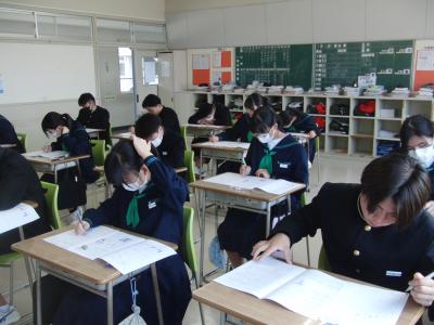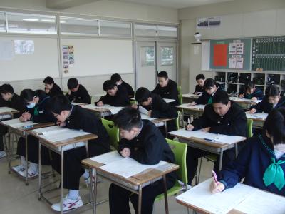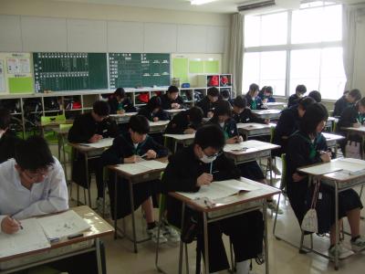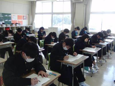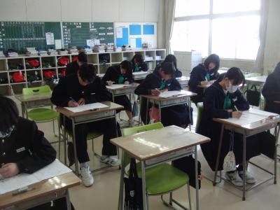 1・2年生は進級テスト、3年生は全国学力状況調査と石川県基礎学力調査を実施しました。どちらも、進級直後の生徒の学力の定着度を評価し、今年1年間の指導改善に生かしていきます。生徒たちは、時間いっぱい問題に取り組んでいました。