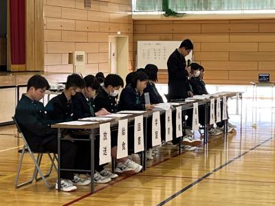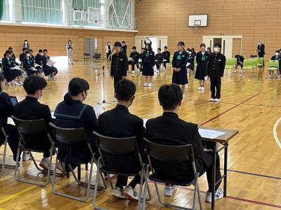 体育館で生徒総会を開催しました。昨年度の取組を修正したり新しい取り組みを加えたりした提案が、各委員会から提示されました。学級で事前に議案書の内容について討議願されていたためか、各学年から積極的な質疑が出され、執行委員や委員長が答弁しました。特に、質問だけでなく自分たちの要望を積極的に述べる1年生の姿が頼もしかったです。